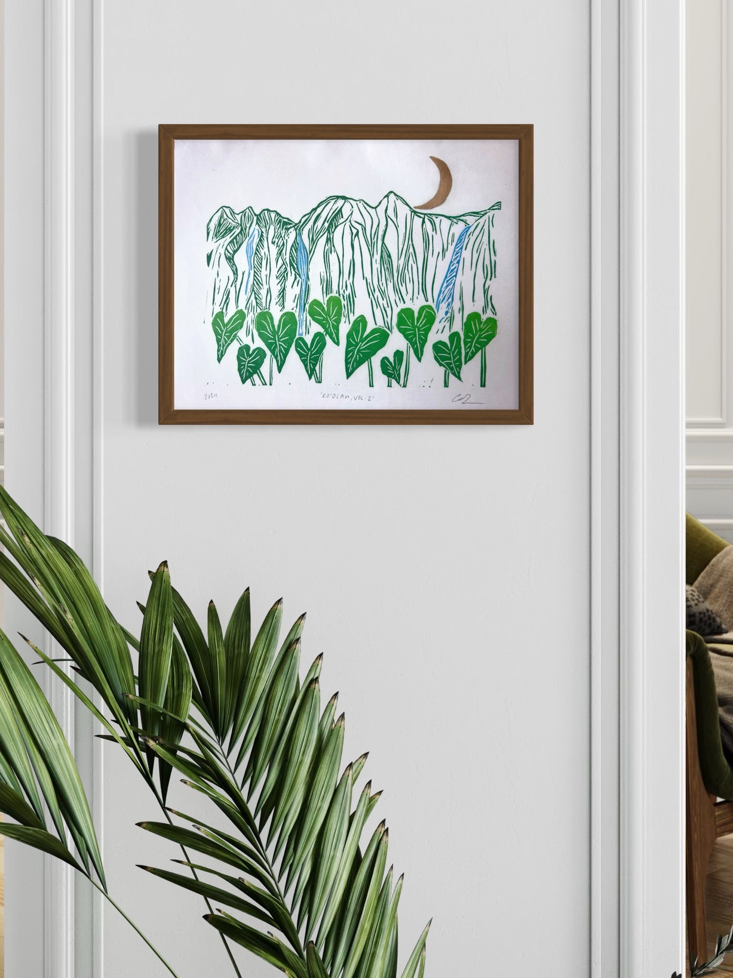 This landscape print depicts a a variation of 'Vol. 1' of a portion of the beautiful Ko’olau Mountain Range on O’ahu, multiple waterfalls, with Kalo (Taro) surrounding and a golden crescent moon.