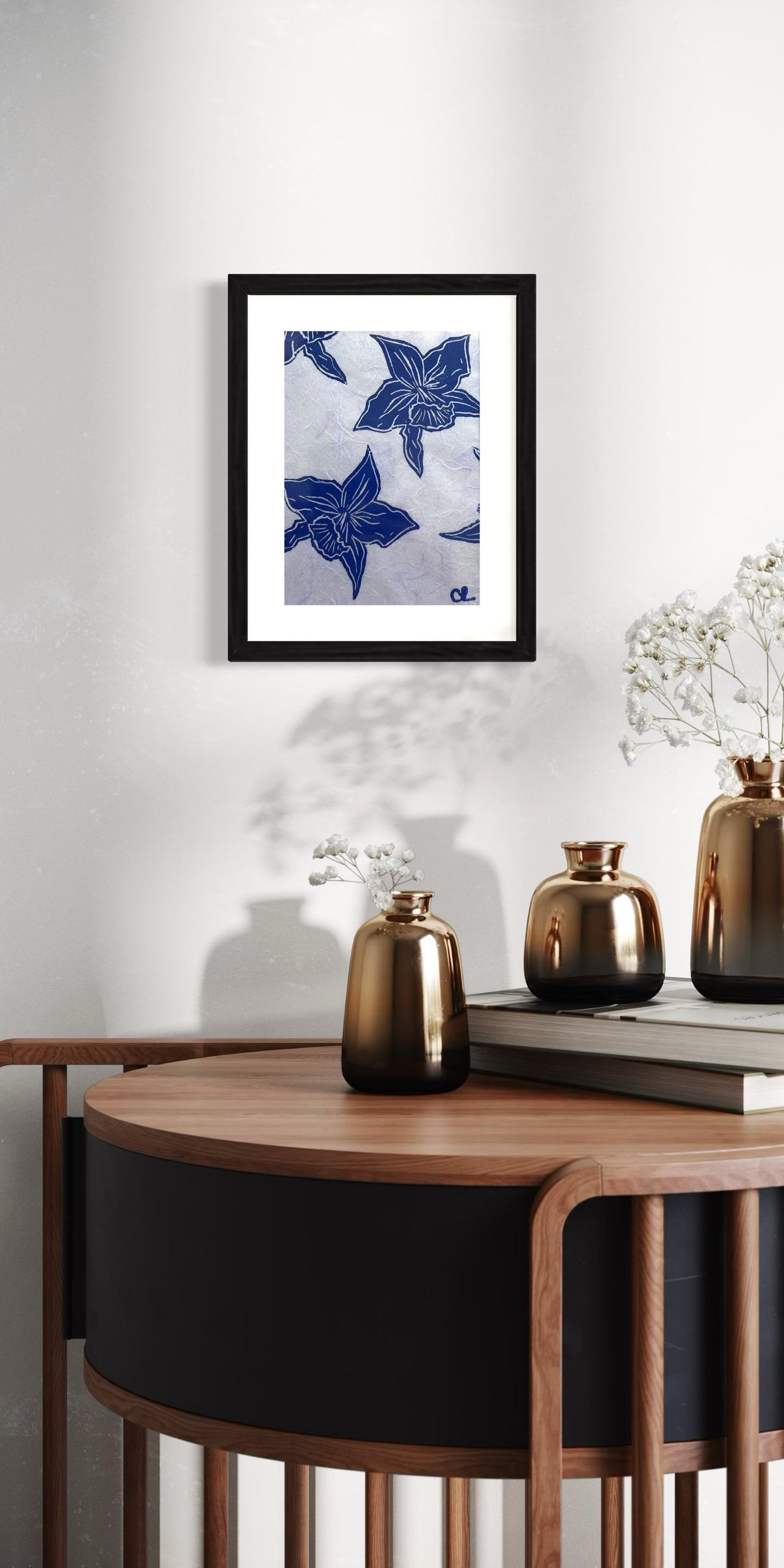 'Mini Orchid' in Lilac, original blockprint, printed on a beautiful light purple Unryu paper.